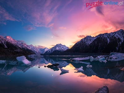 Zachód słońca, Park Narodowy Góry Cooka, Lód, Jezioro, Tasman Lake, Góra Cooka, Nowa Zelandia, Góry
