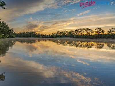 Jezioro Sterenbachsee, Wschód słońca, Odbicie, Niemcy, Drzewa, Chmury, Dolina Wittlicha