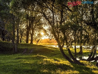 Jezioro, Światło, Łąka, Drzewa, Przebijające