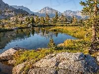 Kamienie, Skały, Góry, Jezioro, Niebo, Drzewa