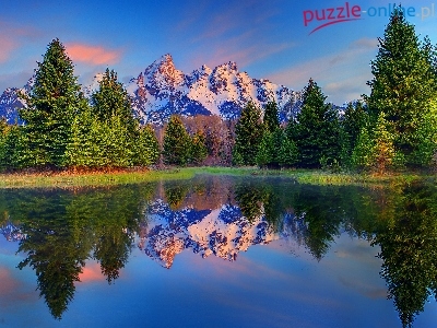 Jezioro, Śnieg, Lustrzane, Góry, Drzewa, Odbicie
