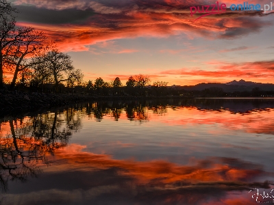 Zachód słońca, Drzewa, Jezioro, Kolorowe, Odbicie, Niebo