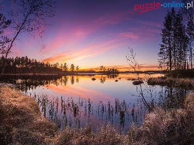 Jezioro Haukkajarvi, Gmina Ruovesi, Zachód słońca, Finlandia, Park Narodowy Helvetinjarvi, Drzewa