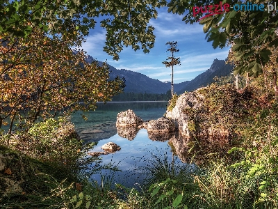 Skały, Drzewa, Góry, Bawaria, Ramsau, Hintersee, Niemcy, Jezioro