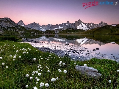 Łąka, Góry, Wełnianka wąskolistna, Krajobraz, Jezioro, Kwiaty