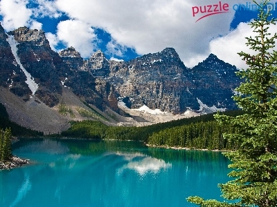 Puzzle Jezioro, Niebo, Góry, Drzewa