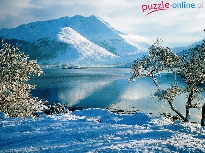 Puzzle Śnieg, Góry, Jezioro, Drzewa