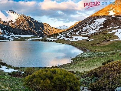 Puzzle Śnieg, Góry, Jezioro, Roślinność