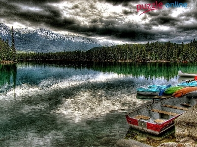 Puzzle Łódki, Góry, Jezioro, Drzewa