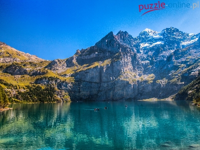 Puzzle Łodzie, Góry, Jezioro, Ludzie