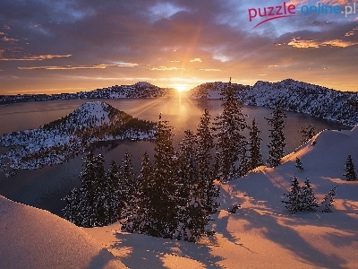 Jezioro, Zachód słońca, Zima, Góry, Drzewa