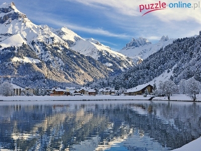 Jezioro, Zima, Góry, Las, Zabudowania