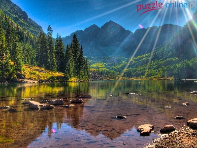 Jezioro, Góry, Słońca, Lato, Las, Promienie