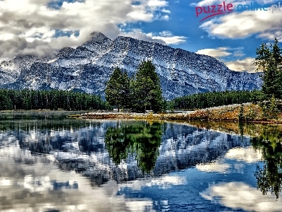 Góry, Jezioro Odbicie, Park Narodowy Banff, Kanada, Lasy