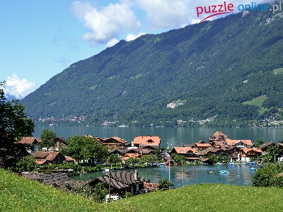 Jezioro, Iseltwald, Góry, Lasy, Miasto