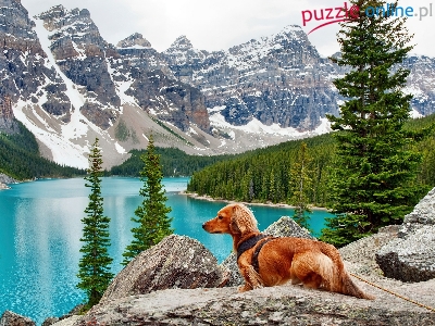 Jezioro, Pies, Góry, Lasy, Skały