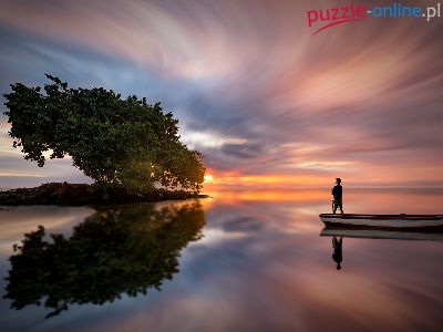 Zachód słońca, Łódka, Jezioro, Drzewo, Mężczyzna
