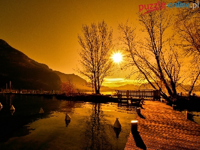 Jezioro, Słońca, Drzewa, Zachód, Molo, Przystań