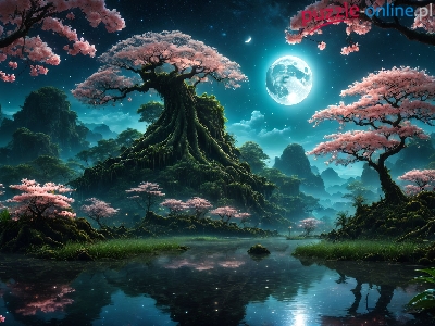 Księżyc, Drzewa, Różowe, Jezioro, Grafika, Noc