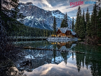 Park Narodowy Yoho, Chmury, Las, Jezioro Emerald Lake, Dom,  Kanada, Góry, Mostek