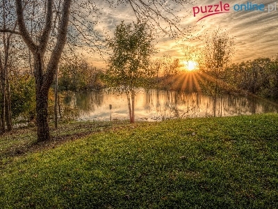 Puzzle Jezioro, Drzewa, Promienie słońca