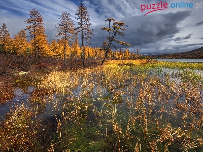 Drzewa, Kołyma, Rosja, Jezioro Sosiednie, Jesień, Szuwary