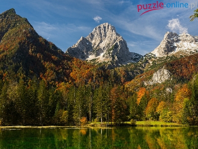 Szczyty, Niebo, Skały, Las, Drzewa, Góry, Jesień, Jezioro