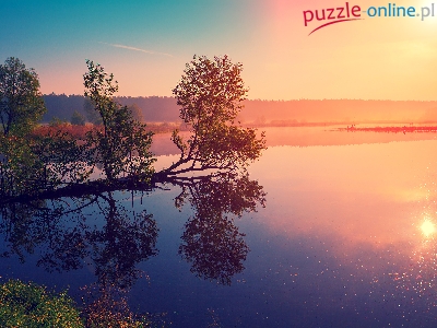 Jezioro, Drzewo, Mgła, Wschód słońca, Wędkarze