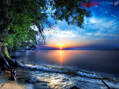 Jezioro, Drzewa, Wschód, Słońca, Brzeg