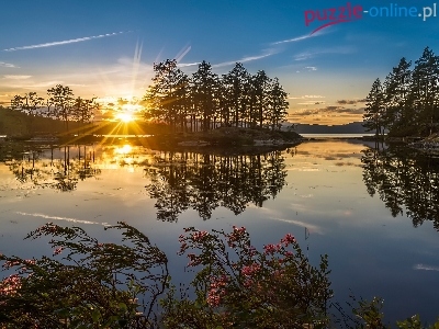 Puzzle Jezioro, Norwegia, Wschód Słońca, Drzewa
