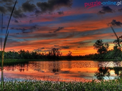 Puzzle Jezioro, Zachód, Słońca, Drzewa