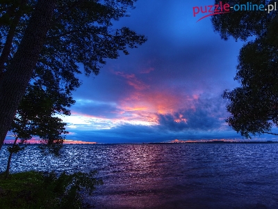 Puzzle Jezioro, Zachód, Słońca, Drzewa