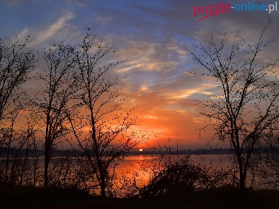 Puzzle Jezioro, Zachód słońca, Drzewa