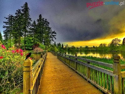 Jezioro, Drzewa, Zachód, Słońca, Mostek