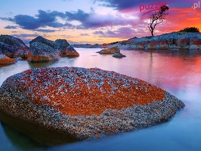 Jezioro, Drzewo, Zachód, Słońca, Kamienie