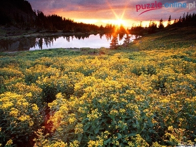 Jezioro, Kwiaty, Zachód, Słońca, Lasy