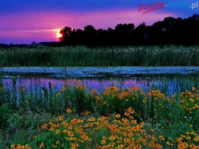 Puzzle Jezioro, Zachód Słońca, Kwiaty