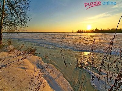 Jezioro, Śnieg, Zachód, Słońca, Drzewo