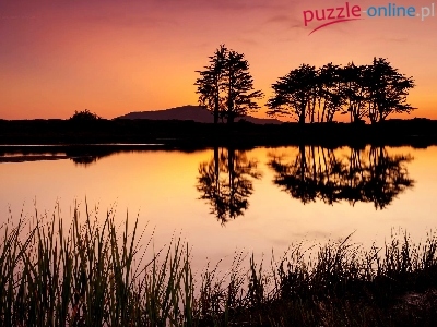 Jezioro, Odbicie, Zachód, Słońca, Drzewa