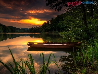 Jezioro, Zachód słońca, Łódka