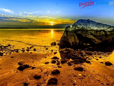 Jezioro, Plaża, Zachód, Słońca, Kamienie