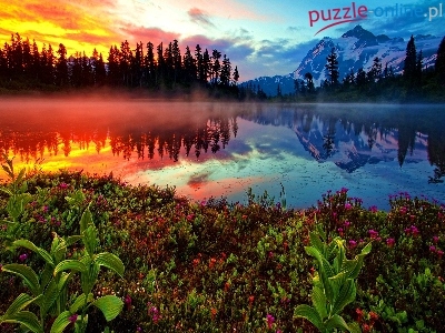 Puzzle Jezioro, Zachód, Słońca, Rośliny