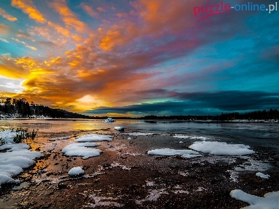 Jezioro, Zima, Zachód, Słońca, Las