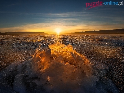 Jezioro, Lodu, Zima, Zachód słońca, Bryła