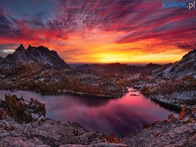 Jezioro Perfection Lake, Stan Waszyngton, Zachód słońca, Stany Zjednoczone, Rezerwat przyrody Alpine Lakes Wilderness, Góry