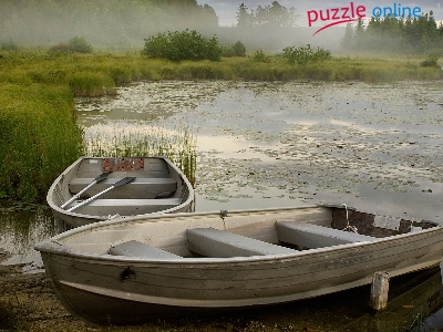 Jezioro, Dwie, Mgła, Łódki, Wiosła, Szuwary