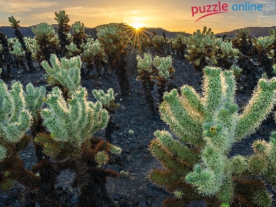 Cholla, Kalifornia, Stany Zjednoczone, Park Narodowy Joshua Tree, Promienie słońca, Kaktusy
