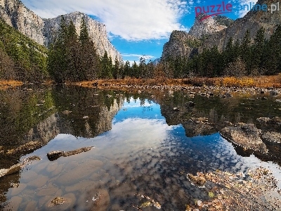 Park Narodowy Yosemite, Stan Kalifornia, Góry, Kamienie, Chmury, Drzewa, Stany Zjednoczone, Dolina Valley, Odbicie