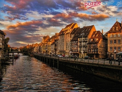 Kamienice, Rzeka, Słońca, Strasburg, Ill, Zachód