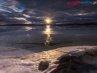 Kamienie, Zima, Słońca, Jezioro, Brzeg, Promienie